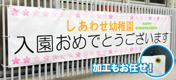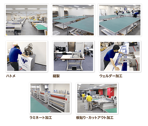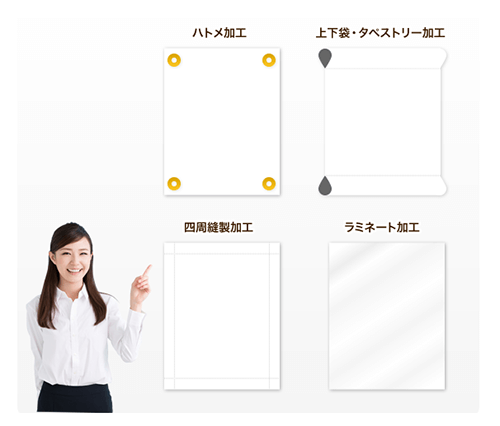 ハトメ/四周縫製加工/ウェルダー加工/上下袋・タペストリー加工/ラミネート加工/板貼り・カットアウト加工など